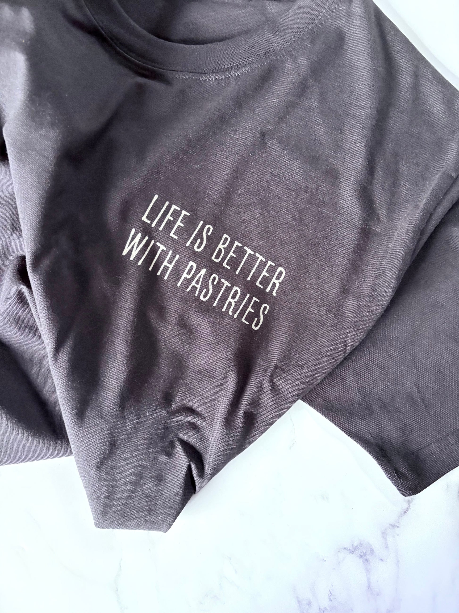 Show your love of pastries with this 'Life is better with pastries' T-Shirt. Now available to order for collection in store.